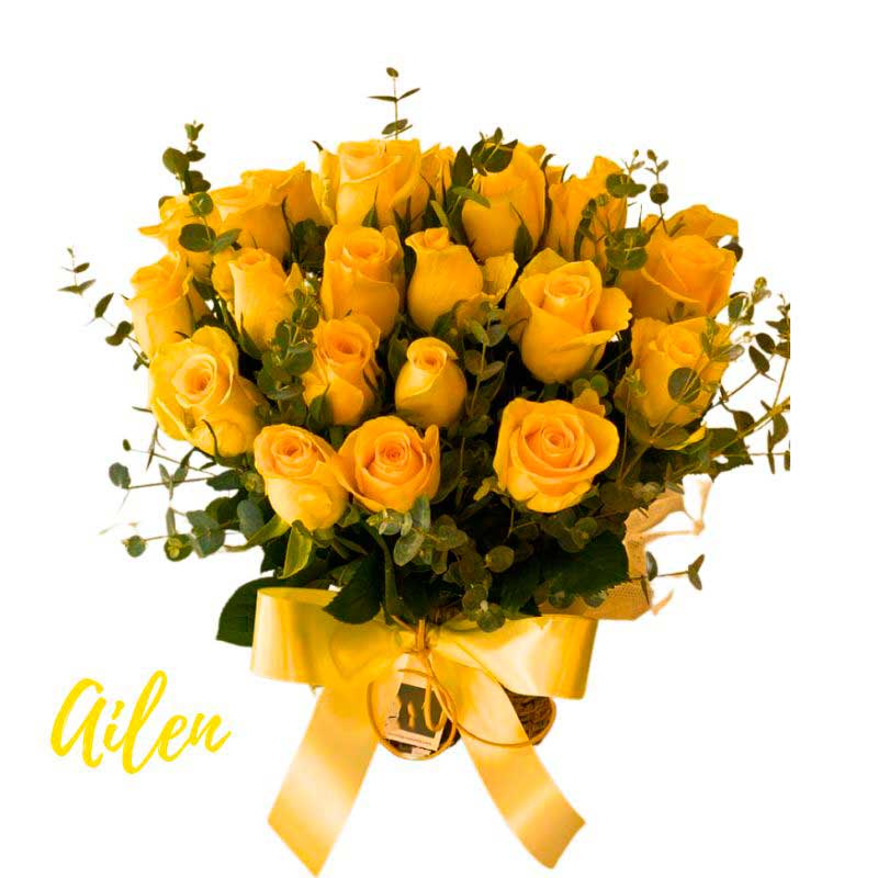 Hermoso arreglo de rosas amarillas en canasta con lazo
