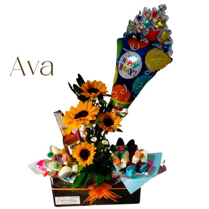 con hermosos girasoles,  dulces, fresas achocolatadas y  globo.