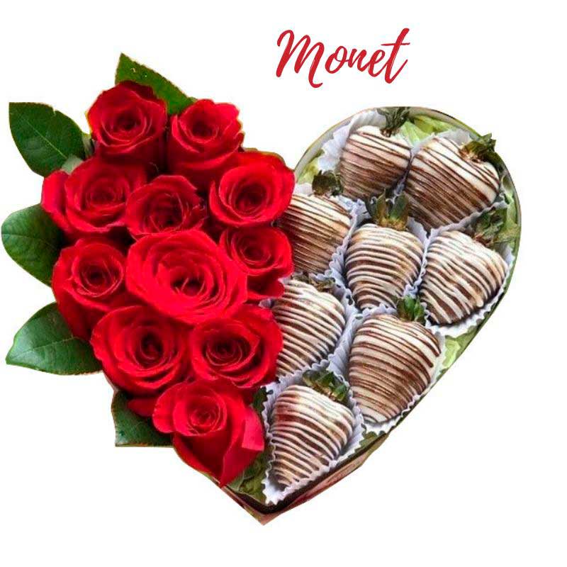 contiene: rosas, deliciosas fresas con chocolates en caja,