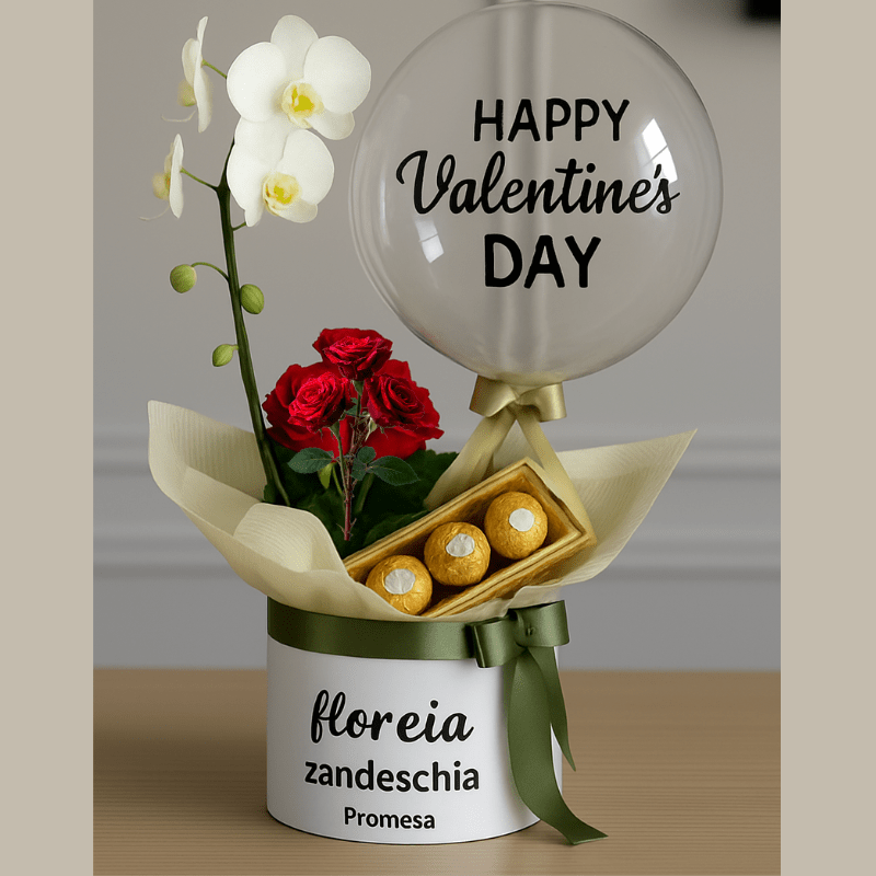 Elegante arreglo floral con orquídeas y rosas rojas, acompañado de globo burbuja decorativo y deliciosos chocolates Ferrero. El regalo perfecto para sorprender con amor, dulzura y estilo en cualquier ocasión especial.