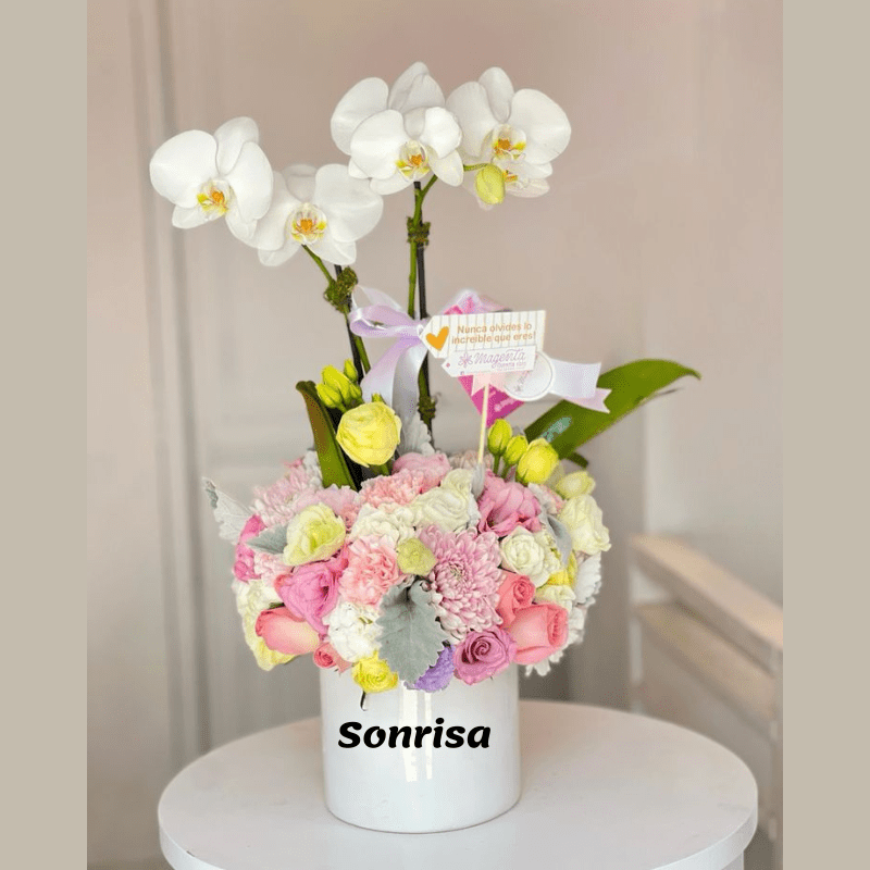 Nuestro arreglo de orquídeas y rosas en colores primaverales combina elegancia, frescura y romanticismo en una hermosa base redonda decorativa.